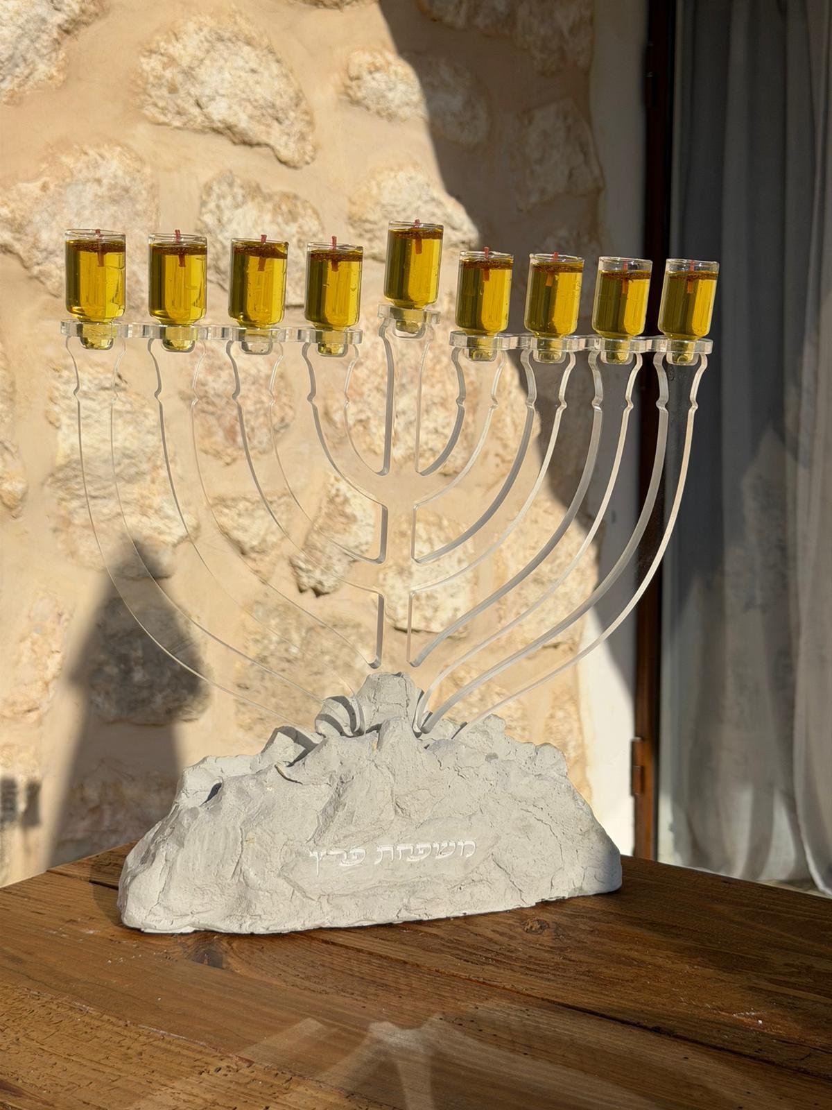 חנוכיית דגם "מנורה אבן" שילוב של אקריל ובטון המשלב את המראה המודרני עם המראה הטבעי.